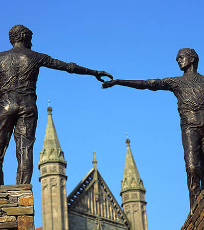 Travel north to Claremorris to visit Ballintubber Abbey, known as “the Abbey that refused to die,” Ireland's only royal Abbey, which has been in continuous use for more than 780 years. Visit Belleek Pottery, then follow the Atlantic shoreline of Donegal Bay to the town of Donegal for some free time. Continue your drive through the majestic Barnesmore Gap to Derry. (B, D)