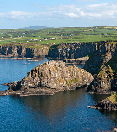 Enjoy the scenic route of the Nine Glens of Antrim, known for views of mountains, valleys, and coastline. Discover the Giant’s Causeway, enormous hexagonal columns, and pause for photos at the Dunluce Castle ruins. Head to Derry for a walking tour with a local guide to see the 17th- century city walls and the Diamond, the main central square. (B, D)