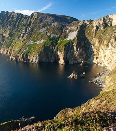 The most direct route to Donegal will have a driving time of less than 4 hours. On route to Donegal you will travel by Ireland’s most visited pilgrimage location, the Shrine at Knock. Shortly after this, you can take a slight detour to the Coleman Irish Music Centre is a celebration of Irish Music, Culture and Heritage as expressed in the South Sligo style of music played by Michael Coleman and other musicians of his time. Southwest of Sligo Town you will find the Ancient Tombs of Carrowmore. Over 60 tombs have been located by archaeologists to date. Dating back to nearly 5,000 B.C. and centuries older than the Pyramids of Egypt, Carrowmore is Ireland’s largest megalithic cemetery and is considered to be one of the most important in Europe. Shortly after leaving Sligo on route to County Donegal you will arrive at Drumcliff Churchyard, perhaps the most visited graveyard in Ireland. William Butler Yeats is buried here under the epitaph that he penned, “Cast a Cold Eye on Life, on Death. Horsemen, pass by!” The Churchyard stands in the shadow of the magnificent Benbulben. Continue north until you reach Belleek home to Belleek Pottery, where there is an excellent visitor centre that is open from April to October. Set up in 1857, the factory is famous worldwide for its ornate fine Parian China. Other major touring attractions in Donegal include the Railway Heritage Centre, Donegal castle and Donegal Craft Village in Donegal town. Heading west from Donegal Town, on the edge of the Atlantic is Ireland’s premier fishing port of Killybegs. Nearby are the magnificent Slieve League Cliffs which at over 1,000 ft. (300 meters) the cliffs are the highest marine cliffs in Europe. Next stop along this route is the Gaelic speaking village of Glencolumbcille where you can take the opportunity to relive local rural life as experienced in 18th, 19th and 20th century Ireland.